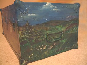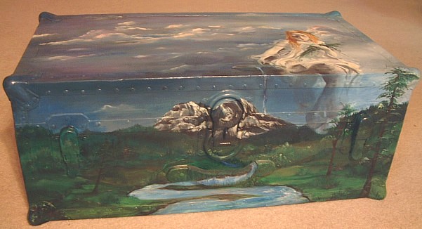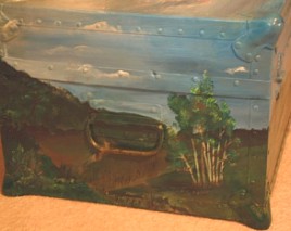 This sturdy trunk is lined with green and blue thai unryu papers.