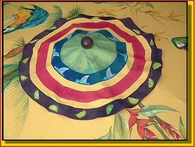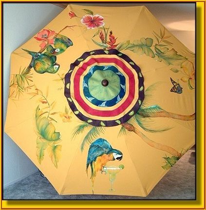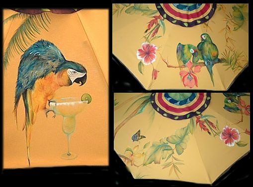 This type of umbrella, made of durable canvas, is the ideal fabric for outdoor use. It has been treated and is water resistant.The pole and support threads are wooden. Fabric paints were used and heat set. They have excellent washfastness and lightfastness and leave the fabric soft and pliable. |