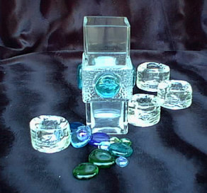 This illusionary piece marries flower and flame. The glass candleholders cascade down the vase spilling into a river of jeweled pebbles.