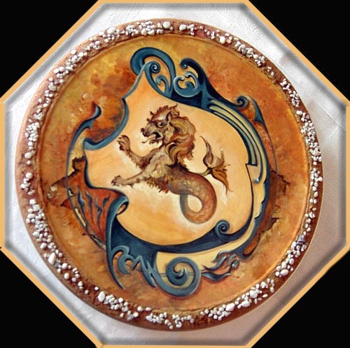For this project I chose a lazy-suzan because much like a potter's wheel, it portrays evolution; a centering point from which an amorphous mass is tactfully shaped. With this beginning point, I broaden the potter's concept of shaping and forming to the sculpting of a family ~ a sense of family heritage. To depict that idea, I reproduced an abstract of a family crest that captured the traits I felt affirmed the client's spirit ~ part dragon, lion and fish.